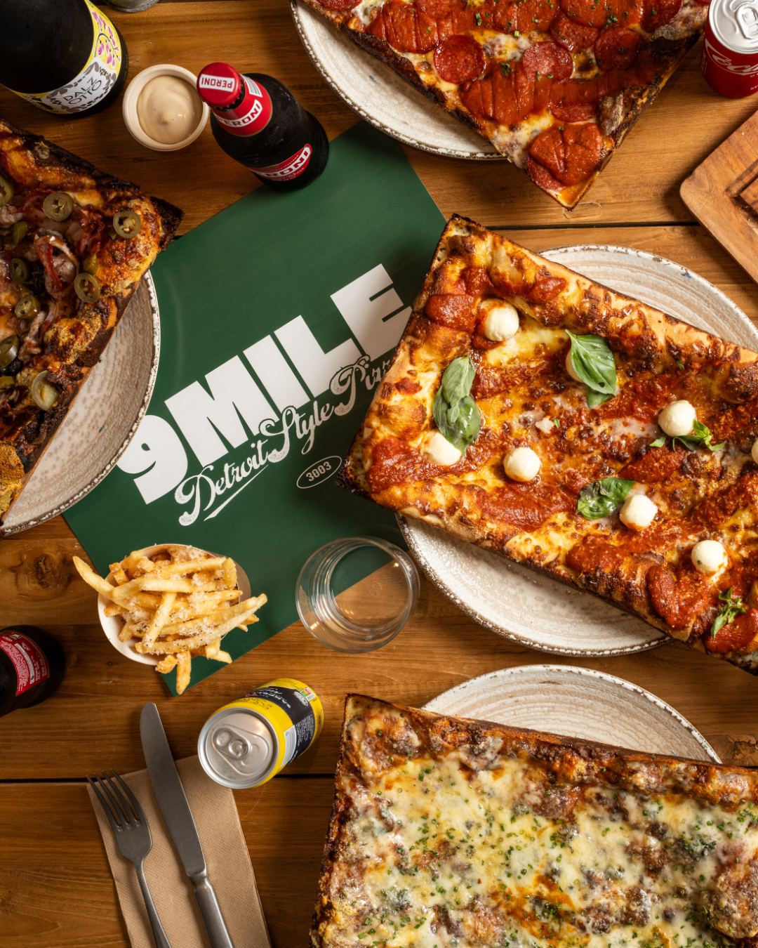 We make square, deep-dish pizzas with thick, airy bases and crispy, caramelised cheese edges - baked the way Detroit intended.